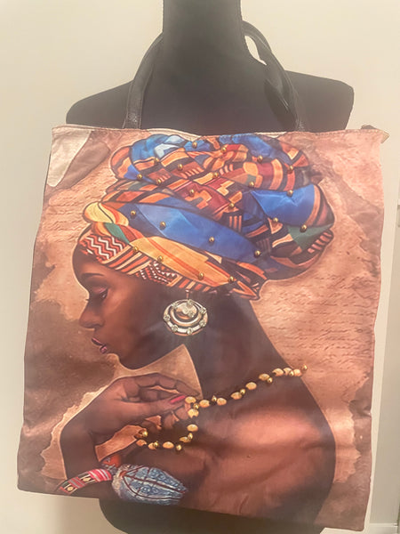 This vibrant tote bag is a true statement piece, showcasing a stunning print of an African woman adorned with a colorful headwrap and exquisite jewelry. The bag features sturdy black handles for comfortable carrying, making it perfect for everyday use. Its spacious interior provides ample room for your essentials, while the unique design adds a touch of cultural flair to any outfit. The high-quality print ensures that the vibrant colors and intricate details remain vivid, making this tote bag a long-lasting and eye-catching accessory. Whether you're heading to work, running errands, or simply want to express your individual style, this tote bag is the perfect choice. It's a beautiful blend of fashion and art, celebrating diversity and cultural richness. Add a touch of global inspiration to your wardrobe with this exceptional tote bag. Material Artificial Leather Width 13.5 Height 15.5 Closure Zip All you need to carry your monetary essentials with ease. It has one main zip compartment and shoulder straps, thus lending it to be a stylish accessory to carry.